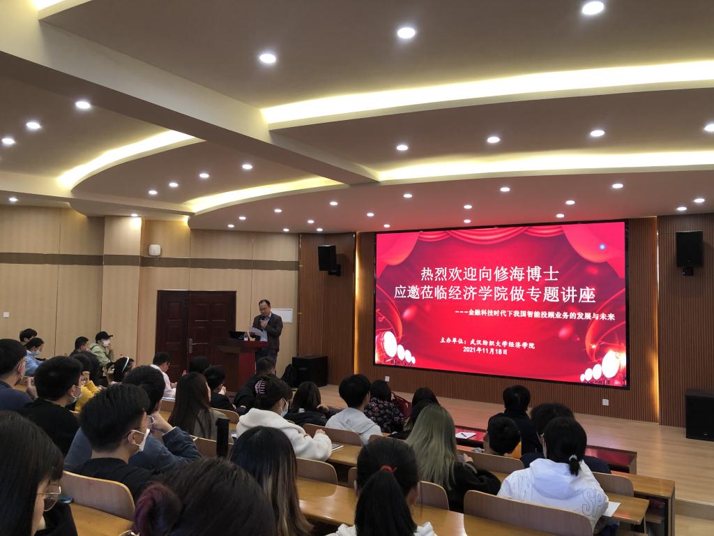 11月18日下午,华中科技大学数量经济学博士、中国金融期货交易所和复旦大学联合培养博士后、优品科技有限公司首席策略管向修海博士应邀来suncitygroup太阳集团以《金融科技时代下我国智能投顾业务的发展与未来》为题开展讲座,suncitygroup太阳集团院长段丁强教授、副院长倪武帆教授、研究生导师代表以及全体研究生和部分本科生参加了本次讲座,讲座由suncitygroup太阳集团院长段丁强教授主持。