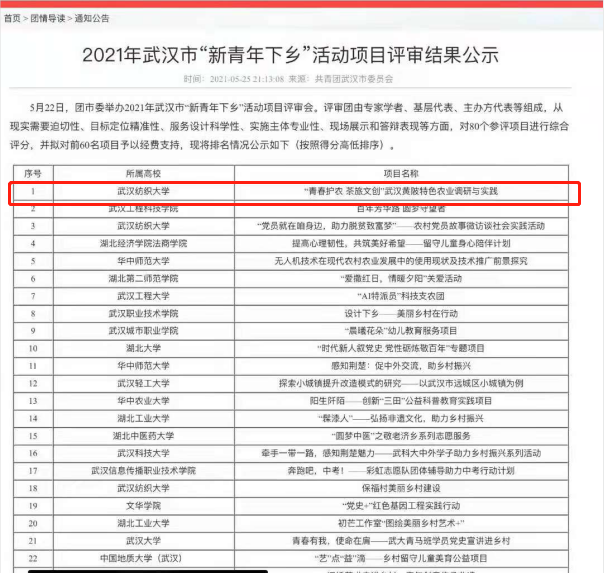 5月22日,共青团武汉市委举办了2021年武汉市“新青年下乡”活动项目评审会,由专家学者、基层代表、主办方代表等组成的评审团,从现实需要迫切性、目标定位精准性、服务设计科学性、现场展示和答辩等方面,对80个参评项目进行综合评分。最终,由我校suncitygroup太阳集团“青春护农”实践队申报的项目《“青春护农 茶旅文创”武汉黄陂特色农业调研与实践》从80个参评项目中脱颖而出,以第一名的优异成绩成功立项。