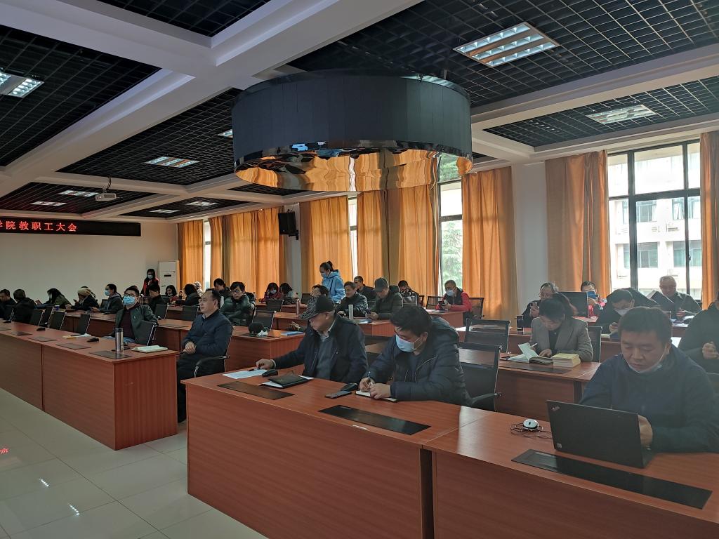 学院院长段丁强以《抢抓机遇,找准短板,明确目标,扎实推进学科专业建设上台阶》为题对学院2021年重点工作的目标与举措进行了解读。他结合学院发展主要指标,从横纵向对比角度,基于具体数据和案例,精准分析了学院发展存在的短板、面临的形势,并从“本科教育、学科建设、科研、研究生教育、学术生态建设”等五个方面对2021年总体工作思路、主要工作目标进行说明,对相关具体工作做了安排部署。他希望,学院全体教职工要凝神聚力、躬身笃行、不负韶华,用自己的实际行动为学院发展添砖加瓦,为人才培养贡献心力。