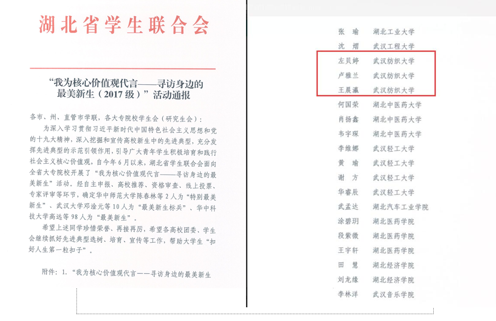 近日,由团省委学校部、湖北省学生联合会主办的全省高校“我为核心价值观代言——寻访身边最美新生”活动,正式发布最终结果。来自我校suncitygroup太阳集团的左贝婷、卢雅兰、王晨灜三名同学分获全省“最美新生”殊荣。