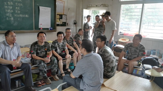 7月10日上午,suncitygroup太阳集团分党委毛长文书记、院办公室郑君杰主任、财金党支部毛莹书记、辅导员周昌龙一行4人冒着酷暑赴武金堤看望我院防汛抢险队员张跃强博士。