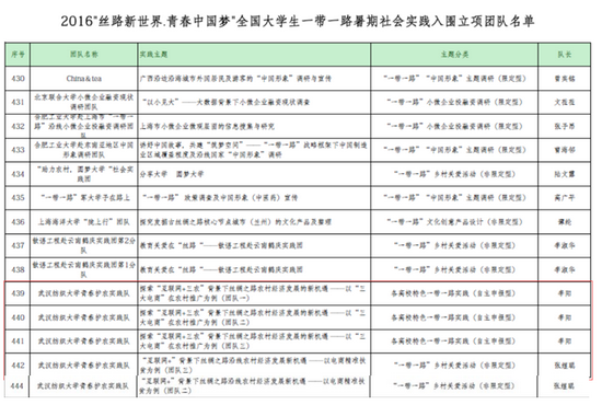据了解,“青春护农”实践队自2012年成立以来,在全国20余个县市进行了社会实践调查,先后获得了2015年团中央“丝路新世界·青春中国梦”一带一路大学生暑期专项社会实践优秀团队、优秀纪录片、优秀社区宣讲队、优秀调研报告、优秀个人等诸多荣誉;2013-2015年连续三年荣获团中央全国大中专学生暑期“三下乡”实践活动优秀团队;2012-2015年连续四年获湖北省大中专学生暑期“三下乡”实践活动优秀团队等诸多荣誉。
