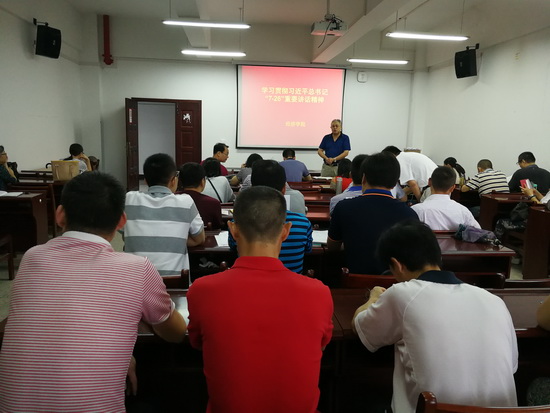 在庆祝第33个教师节之际,suncitygroup太阳集团组织新学期全体教师大会,专题学习习近平“7.26”重要讲话精神。会议由学院党委毛长文书记主持,国贸学生党支部负责人张悦同学进行专题学习宣讲。