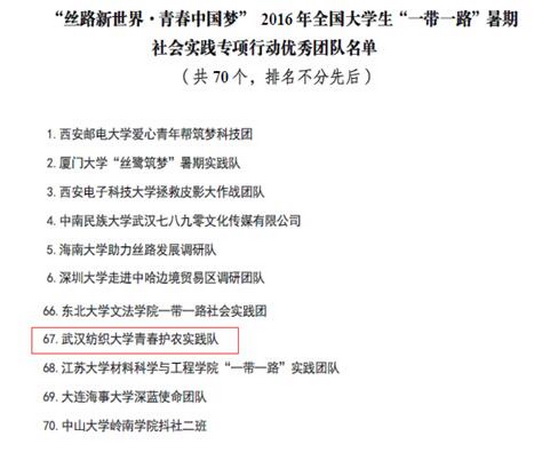 11月30日,由团中央学校部和中国大学生一带一路协同发展行动中心组织开展的“丝路新世界·青春中国梦”2016年全国大学生“一带一路”暑期社会实践专项行动获奖名单出炉。我校“青春护农”社会实践队从全国300余高校的913支团队中脱颖而出,荣获“优秀团队”荣誉(共70支团队获此殊荣),这也是该团队继获得团中央2016年“千校千项”专项荣誉后的又一殊荣。