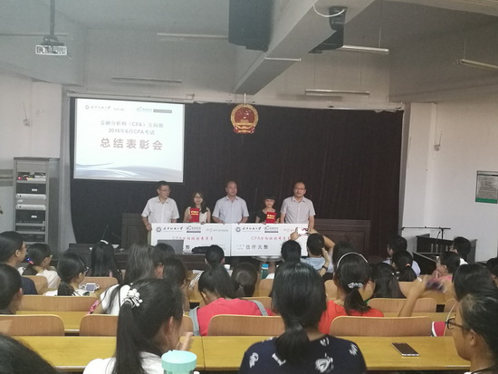 随后,suncitygroup太阳集团分党委毛长文书记宣布表彰决定,授予以10门课程全优成绩通过考试的史娟、徐颖两位同学“CFA方向班优秀学员”称号,并各奖励人民币五千元;对于通过考试的吕宙等九位同学给予通报表扬,并各奖励人民币五百元。教务处同小军处长、高顿财经华中区区域总监刘锐先生上台为学生颁发奖状和奖金并合影留念。