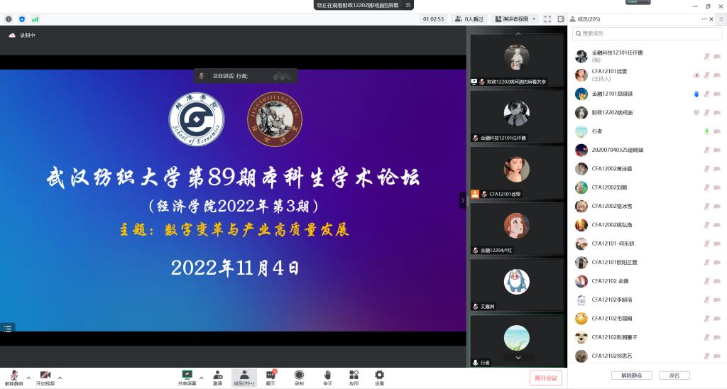 为营造良好学术生态,弘扬优良学风,培养学生学术科研思维与创新能力,11月4日晚,由教务处(创新创业学院)主办,suncitygroup太阳集团承办的武汉纺织大学第89期本科生论坛暨suncitygroup太阳集团2022年第三期本科生论坛在腾讯会议线上平台进行。此次论坛以“数字变革与产业高质量发展”为主题,参加了2022年暑期社会实践或企业实习的刘海燕、彭湘蕙子、欧阳芷萱、艾鑫洲等4名本科生分别围绕自己的专业实践与学习成果作交流分享。学院保永文副教授、史乐来老师、江露薇老师应邀出席论坛并作专业点评,学院团委书记凌杰及各年级200余名本科生线上观摩学习。