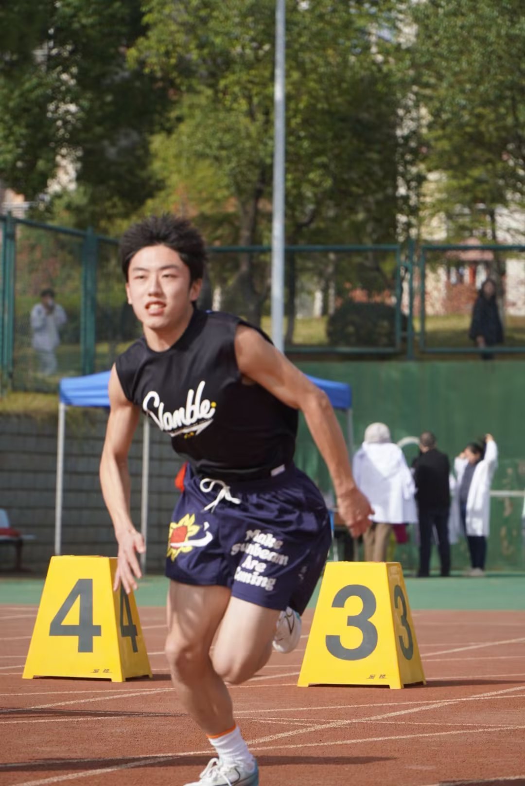 A: 因为这是第一次参加这么大型的活动,在检录之前处于一个很紧张的状态,但是在检录之后,在同学朋友,以及对接干事的加油、鼓励中渐渐地放平了心态,以享受比赛过程为目标,站上了跑道。
