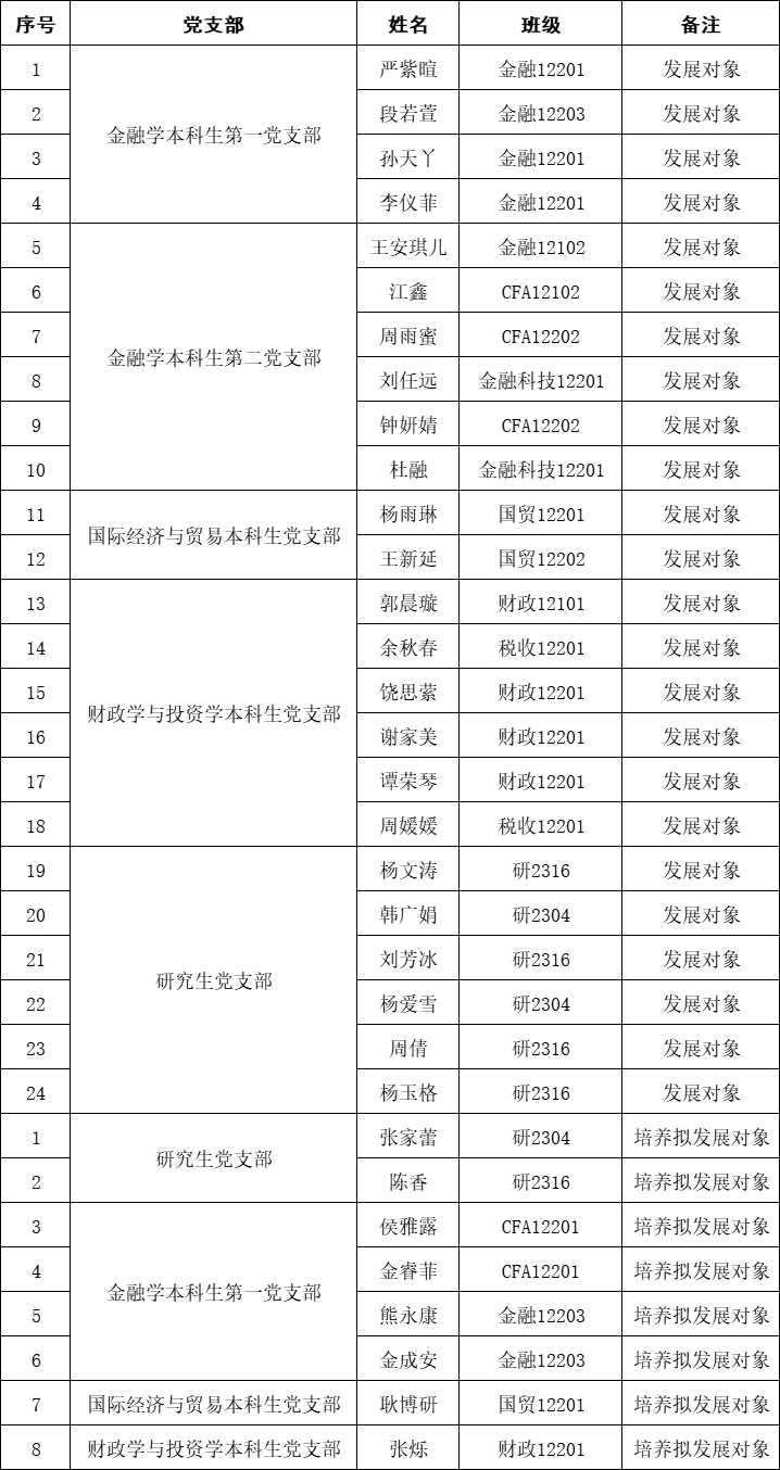 根据《中国共产党章程》和《中国共产党发展党员工作细则》规定,经基层团学组织推荐、综合考评考察、党支部审议、学院党委审查决定,拟将以下24名学生列为发展对象、8名学生列为培养拟发展对象,现予以公示: